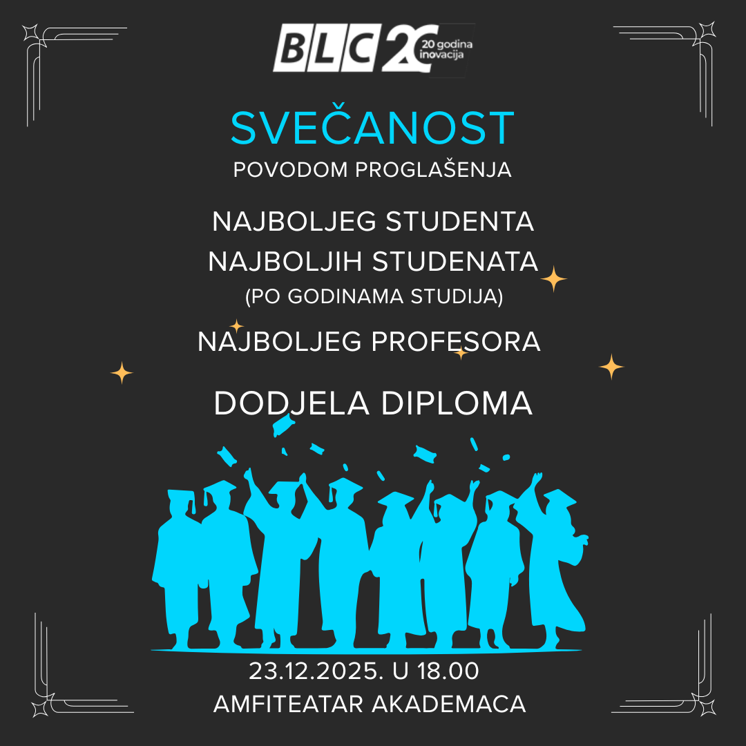 Poštovani studenti i profesori, Sa posebnim zadovoljstvom vas obavještavamo da će se Svečanost povodom proglašenja najboljeg studenta BLC-a, najboljih studenata po godinama studija, najbolje ocijenjenog profesora prema glasovima studentske ankete, kao i svečana dodjela diploma održati 23.12. u 18.00 časova …